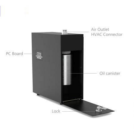 Commercial aroma diffuser S5000 adopts patented-technology of micron atomization which makes scent diffusing in interior space quickly and connect to HVAC system covering upto 7000 sq.ft.. There is a intelligent LCD display for setting of working periods and concentration control. The device will be scent on & off automatically based on your setting. It’s optional to build in WIFI system to control the machine by APP directly, which is ease of operation. APP controlled system achieve batch management and liquid level detection, etc. Humanized design of adjusted diffusing time, scent flavor automatically based on setting, creating a pleasant atmosphere. Build in powerful and long lifespan air pump to make sure the enough scent for large area 2000m3, also build-in 500ml aluminum bottle can last for 1 month more. It’s practical scent diffuser with concise durable shell , and designed with lock & key to make it safer for using, also being widely used in some commercial places.